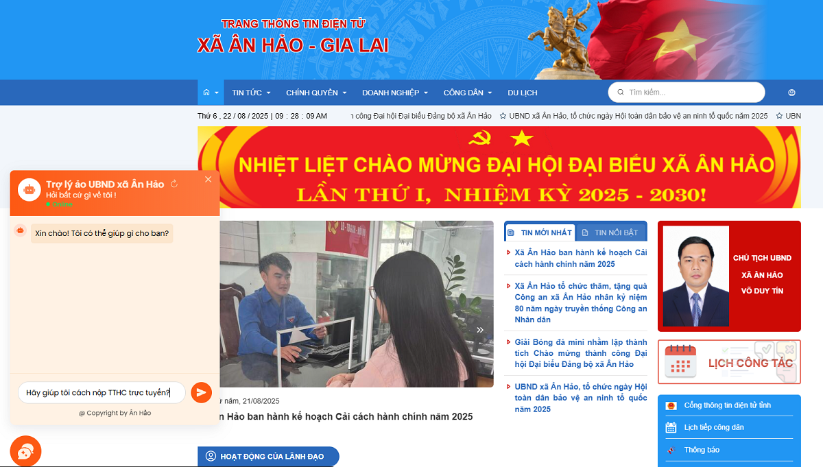 Trợ lý ảo được thiết kế với nhiều tính năng nổi bật như: hỗ trợ tra cứu thông tin thủ tục hành chính, hướng dẫn người dân chuẩn bị hồ sơ theo đúng quy định, giải đáp nhanh các thắc mắc về dịch vụ công trực tuyến; đồng thời tích hợp thông tin về lịch tiếp công dân, các chương trình, chính sách an sinh xã hội của xã. Bên cạnh đó, hệ thống còn hướng dẫn người dân các chức năng nhắc lịch hẹn, tiếp nhận phản ánh – kiến nghị của người dân một cách kịp thời và chính xác.